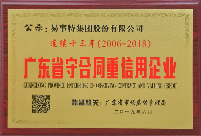近日,“廣東省守合同重信用企業(yè)”名單公示,易事特集團(tuán)憑借良好的信譽(yù)連續(xù)十三年(2006-2018)獲評(píng)“廣東省守合同重信用企業(yè)”榮譽(yù)稱號(hào)。
