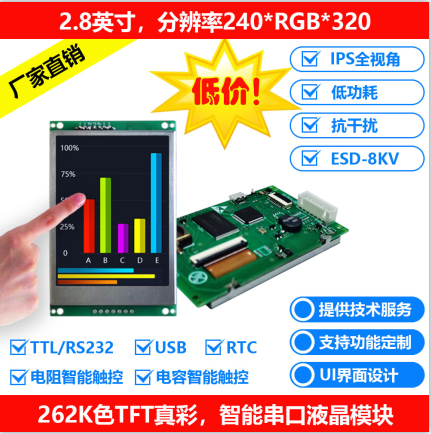 2.8寸TFT液晶屏 240*320智能串口彩屏IPS全視角可橫屏豎屏顯示